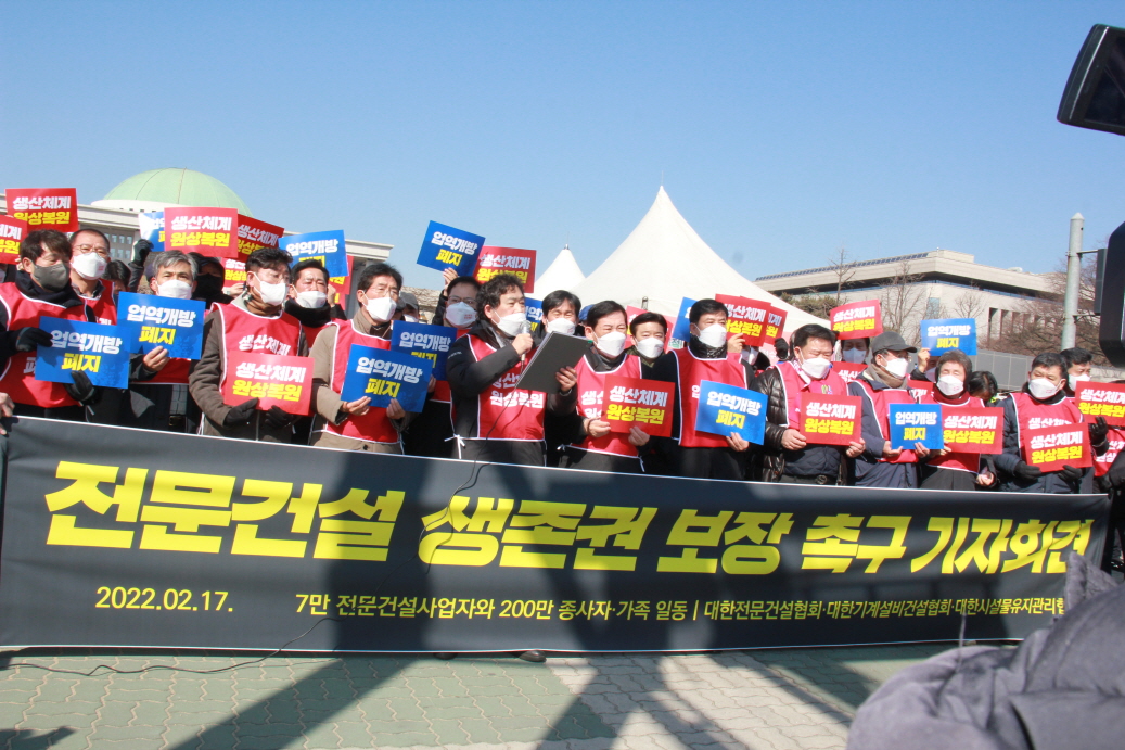 Àü¹®°Ç¼³¾÷°è°¡ 17ÀÏ 12½Ã 30ºÐ ¿©Àǵµ ±¹È¸¾Õ¿¡¼ 'Àü¹®°Ç¼³¾÷ »ýÁ¸±Ç º¸Àå Ã˱¸' ±âÀÚȸ°ßÀ» ÁøÇàÇϰí ÀÖ´Ù.