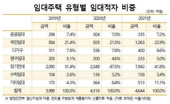 2021³â ÀÓ´ëÁÖÅà À¯Çüº° ÀÓ´ëÀûÀÚ ºñÁßÀ» º¸¸é Àå±âÀü¼¼°¡ 1942¾ï¿ø, ±¹¹ÎÀÓ´ë°¡ 1,063¾ïÀ¸·Î °¢°¢ Àüü ÀÓ´ëÀûÀÚÀÇ 41.8%, 22.9%¸¦ Â÷ÁöÇß´Ù.