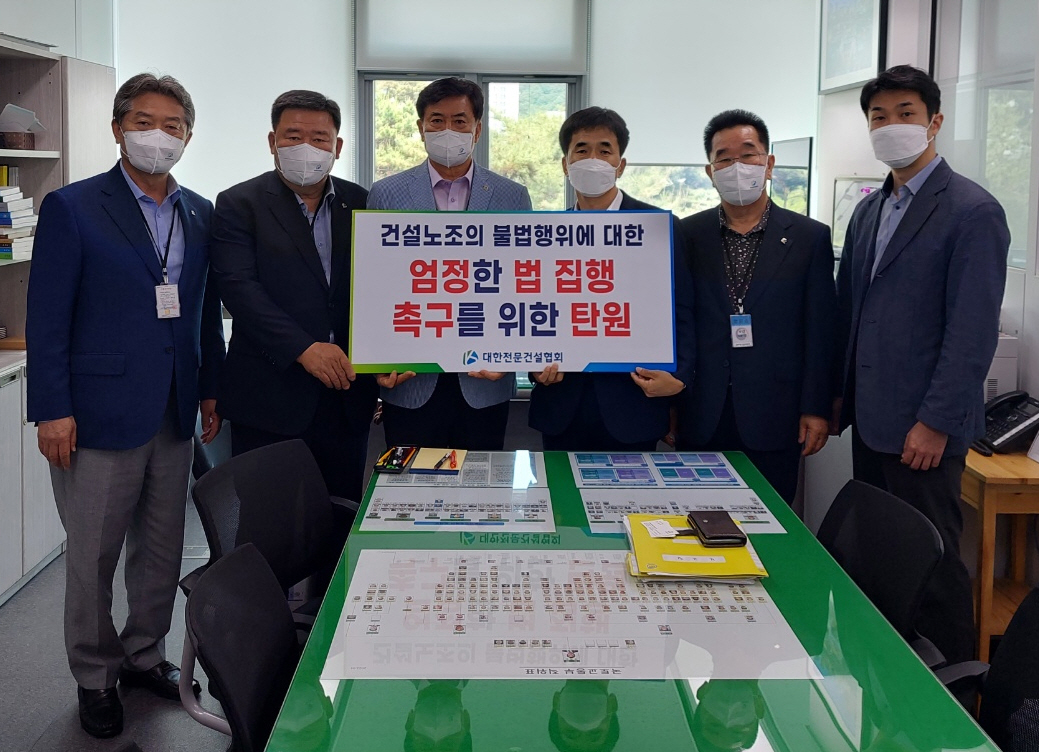 ź¿ø¼­´Â ´ëÇÑÀü¹®°Ç¼³Çùȸ ȸÀå´ÜÀÌ ´ëÅë·É½Ç, Á¤ºÎ °ü°èºÎó ¹× ÁÖ¿ä Á¤´ç °ü°èÀÚ¿¡°Ô Àü´ÞÇÏ°í °Ç¼³ÇöÀå Á¤»óÈ­¸¦ ÅëÇÑ ¼º½Ç½Ã°øÀ» À§ÇØ °Ç¼³³ëÁ¶ÀÇ ºÒ¹ýÇàÀ§¿¡ ´ëÇÑ Ã¶ÀúÇÑ Á¶»ç¿Í ¾öÁ¤ÇÑ ¹ýÁýÇàÀ» Ã˱¸ÇÏ´Â ÇÑÆí °Ç¼³ÇöÀå¿¡¼­ ³ëÁ¶ÀÇ ºÒ¹ýÇàÀ§°¡ ±ÙÀýµÉ ¶§±îÁö Áö¼ÓÀûÀ¸·Î ´ëÀÀÇØ ³ª°¥ °ÍÀÓÀ» È®°íÈ÷ Çß´Ù.